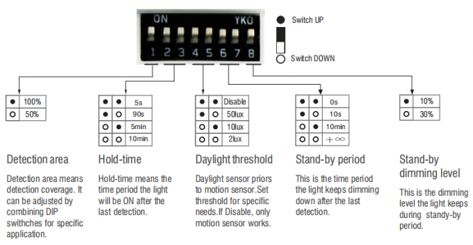 Das Licht schaltet sich ein, wenn Personen in den Erfassungsbereich treten. Nachdem die Personen den Bereich verlassen haben, leuchtet das Licht noch eine Zeit lang, die sogenannte „Haltezeit“. Nach der „Haltezeit“ gibt das Licht eine geringe Leistung ab und leuchtet noch eine Weile, die sogenannte „Standby-Dimmung“ und „Standby-Zeit“. Nach der Standby-Zeit wird das Licht ausgeschaltet.