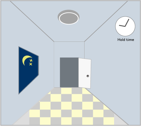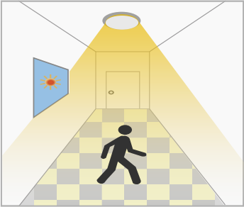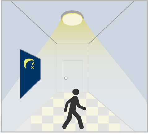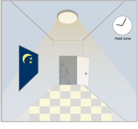 Licht an, wenn Bewegung erkannt wird und aus, nachdem die Leute nachts weggegangen sind. Anwendungen: Korridor, Treppenhaus. Die Tageslichtschwelle ist auf „2 Lux, 10 Lux, 50 Lux“ eingestellt.